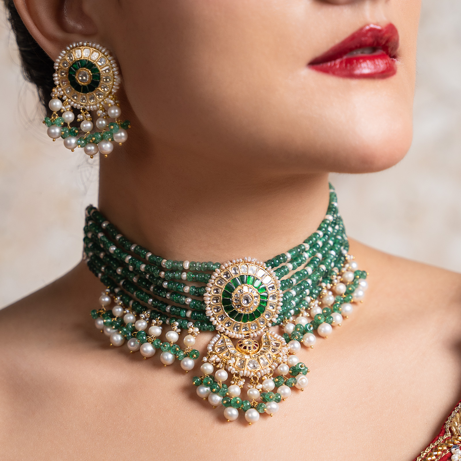 • Zeenat Red Choker + Earring Polki Set A